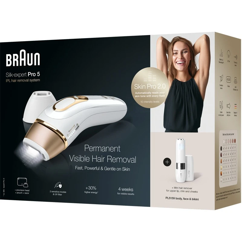 Braun IPL Silk Expert Pro 5 (PL5159) er et smart apparat med professionel lysteknologi, som kan fjerne synlige, uønskede hår i ansigtet og på kroppen. Hvis det anvendes som anbefalet, kan man opnå permanent hårreduktion på kun 4 uger, individuelle resultater kan variere, og giver dig salon-glat hud i op til 6 måneder. Dette apparat er ikke en laser, men virker ved at udsende lysimpulser, kaldet IPL (Intense Pulsed Light), som angriber pigmenterne i hårsækken for at bryde hårets cyklus og dermed forhindrer et nyt hår i at vokse ud.