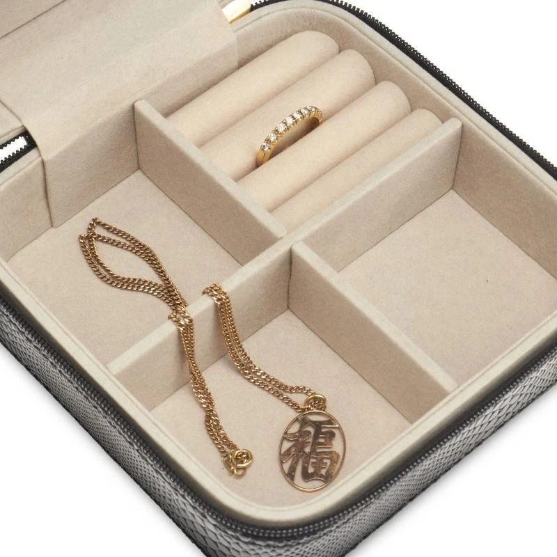 Smykkeskrinet lukkes med lynlås, og er designet i et stilrent læder-look med et flot “slange-aftryk”, som er fremstillet af vegansk PU materiale. I låget er der et indbygget spejl, så du altid kan tjekke om alt sidder som det skal.
