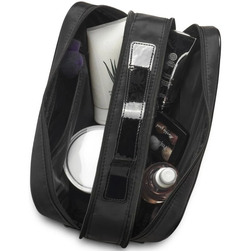 Gillian Jones Spa 2 Room Quilt Bag er en stor og praktisk toilettaske, der passer perfekt til dig, som ønsker organisering, samt en masse plads, så man ikke behøves undvære noget på rejsen. Den har to store rum, som begge lukkes med lynlås. I den ene store rum er der 2 åbne lommer, og i det andet er der 2 åbne lommer samt et mindre rum, der lukkes med lynlås. Tasken er skabt i sort nylon, der er utrolig nemt at rengøre, og har derudover sorte lak detaljer.