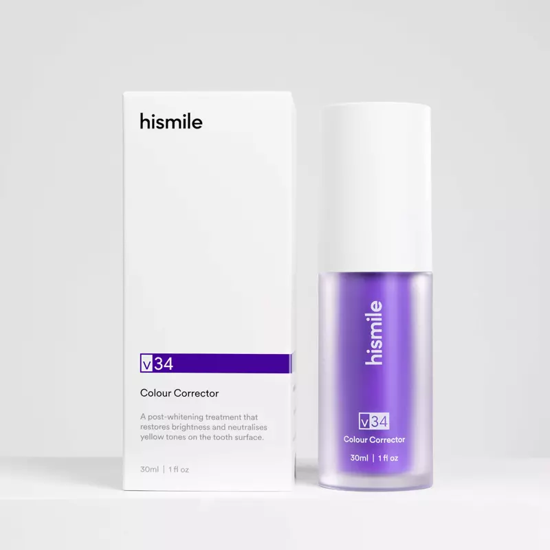 Hismile V34 Colour Corrector Serum er et helt fantastisk serum, som modvirker gullige undertoner og gør dine tænder lysere. Dette serum bruger en farvekorrigerende teknologi, der virker ved at afbalancere tændernes varme og kølige toner, og midlertidigt giver dine tænder et lysere og hvidere udseende.