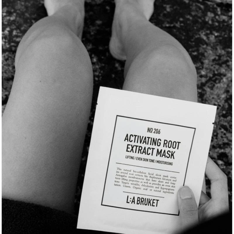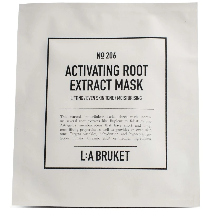 L:A Bruket 206 Activating Root Extract Mask er en pakke indeholdende 4 eksklusive sheetmasker. Masken er fremstillet i naturligt bio-cellulose, som føles fantastisk på huden. Den indeholder flere forskellige rodekstrakter, som har både kort- og langtidsvirkende egenskaber. Den virker behandlende og modvirkende på rynker, tør hud og hyperpigmentering. Den giver en mere ensartet hudtone, og en fantastisk glød, samtidig med at den arbejder på at gøre huden mere spændstig. Den har en anti-inflammatorisk virkning, og stimulerer kollagendannelsen, så huden vil få en mere fast struktur. Masken kan bruges af både mænd og kvinder, er veganvenlig, samtidig med at den er uden parabener. Det sikre valg til dig, der gerne vil have en smuk og fornyet glød, og som godt kan lide at forkæle sig selv lidt ekstra i ny og næ.