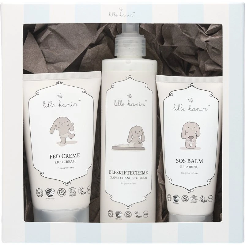 Lille Kanin Pleje Sæt indeholder en Fed Creme, som modvirker tørhed og beskytter mod væskepåvirkning, der kan udtørre eller irritere huden. Æsken byder også på en multifunktionel SOS Balm, som kan bruges til røde numser, ru kinder, tør hud m.m., samt en Bleskiftecreme, som kan bruges til forebyggelse af rød og øm numse.