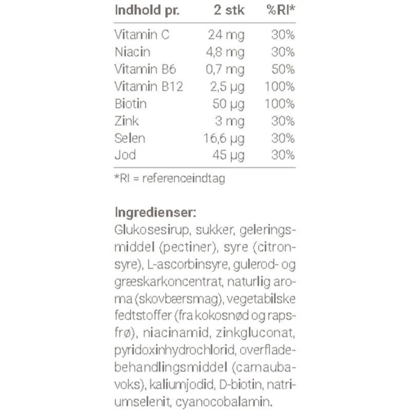 Livol Gummies Hair & Nails er dit daglige tilskud af biotin, zink, selen mfl. i velsmagende gummies med lækker skovbærsmag. Biotin bidrager til et normalt hår. Zink bidrager til normale negle. Vitamin B12 bidrager til et normalt stofskifte.