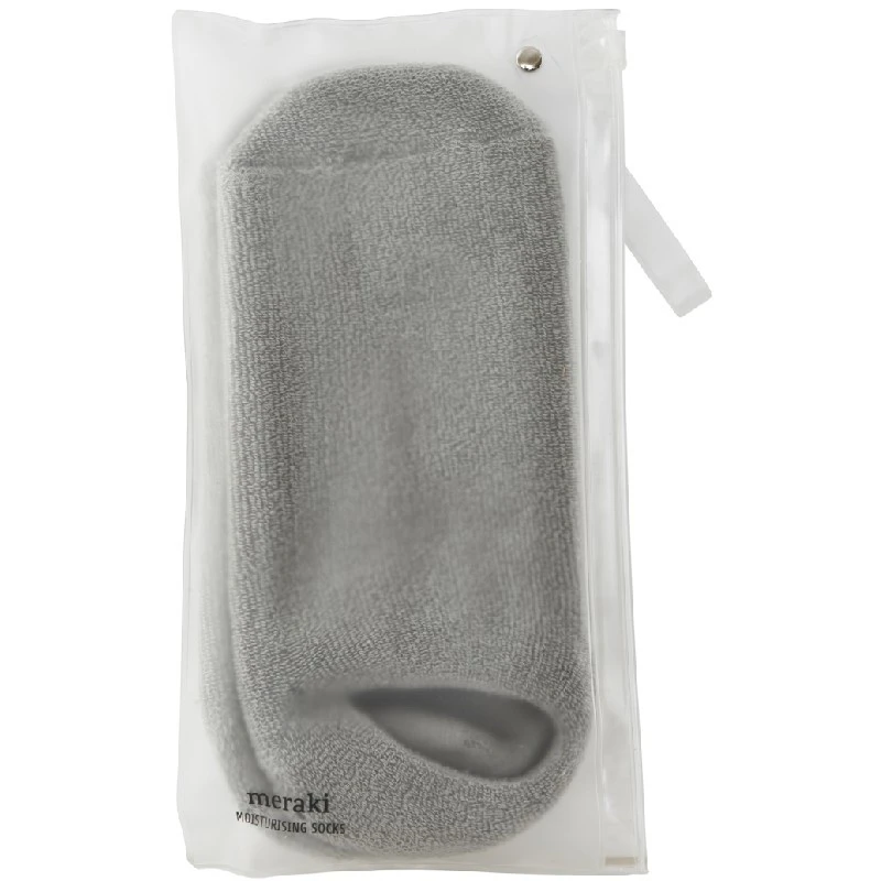 Meraki Moisturising Socks er lækre fugtighedssokker perfekte til, at forkæle dine fødder. Særligt velegnet til at pleje og give intens fugt til dine fødder, så du nu kan komme de tørre fødder og hæle til livs. Sokkerne er super nemme at anvende, og de er skabt til at give smukke og velplejede fødder. Du kan skabe din egen lille wellness salon i dit eget hjem. Sokkerne har en skøn terapeutisk duft at urter, der giver en afslappende følelse når man har dem på. Tag et dejligt varmt bad, smør dine fødder godt ind med din yndlings fodcreme, tag derefter sokkerne på, og behold dem på indtil cremen er trængt helt ind i huden. Du vil opleve af du får en helt anden effekt af din fodcreme og du nu vil have flotte fødder som resultat.