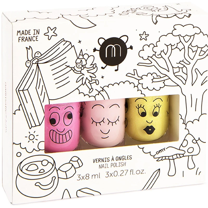 Nailmatic Kids Nail Polish Set – Magic Forest er et fantastisk sæt med 3 neglelakker i flotte farver, der giver dine børn smukke negle, uden brug af kemi og skrappe midler. Lakkerne er vandbaserede, hvilket vil sige, at alt du skal gøre for at få dem af igen, er at vaske fingrene med varmt vand og sæbe.