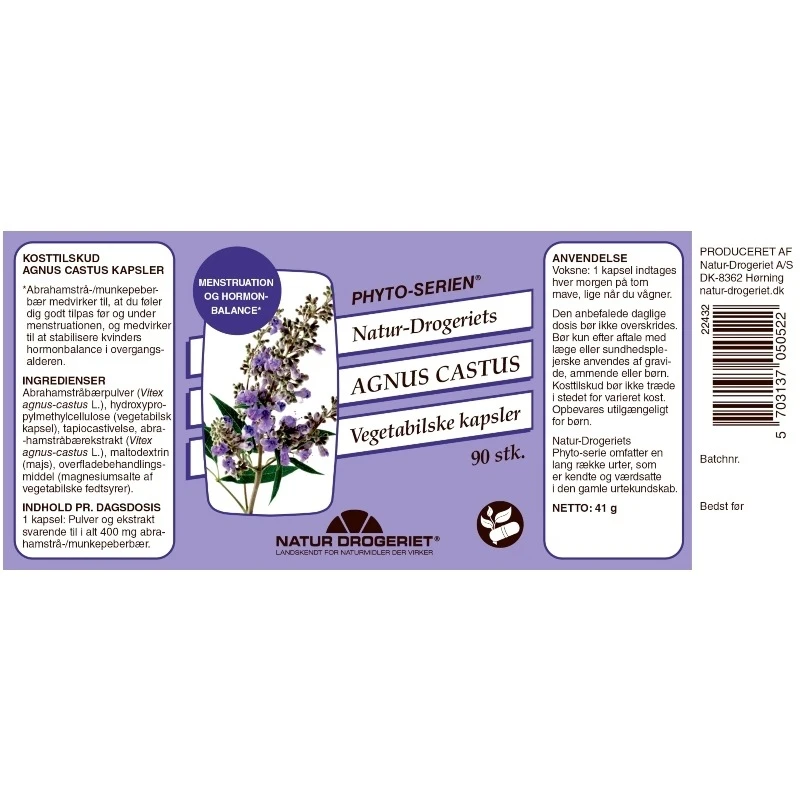 Natur Drogeriet Agnus Castus bidrager til den kvindelige hormonbalance og hjælper med at opretholde et fysiologisk velvære i menstruationscyklussen. Desuden medvirker agnus castus til at mindske gener og stabilisere hormonbalancen i forbindelse med overgangsalderen.