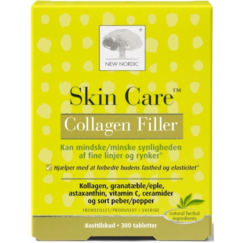 New Nordic Skin Care Collagen Filler 300 Pieces er skønhed indefra, i form af kosttilskud. Skin Care™ Collagen Filler tabletten mindsker synligheden af fine linjer og rynker. Tabletten hjælper også med at forbedre hudens fasthed og elasticitet.