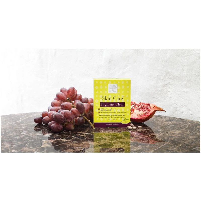 New Nordic Skin Care Pigment Clear 60 Pieces er baseret på indiske stikkelsbær, samt standardiseret ekstrakt af granatæble og naturlig astaxanthin. Tabletten indeholder kobber, som bidrager til normal hudpigmentering. Tabletten indeholder desuden vitamin C, der bidrager til normal dannelse af kollagen, som har betydning for normalt fungerende hud. Tabletten er et godt supplement til den daglige skønhedspleje.