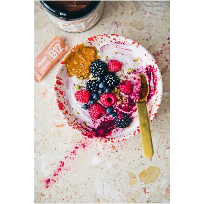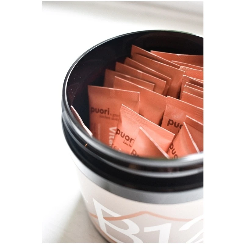 Puori Vitamin Berry Booster B12 er et kosttilskud til voksne som ikke kan lide at sluge piller eller kapsler, og som gerne vil have sine vitaminer i forbindelse med et måltid. Vitamin B12 Berry Booster er et innovativt vitamin B12 tilskud. Det indeholder den aktive og letoptagelige form for vitamin B12, methylcobalamin, og er blandet med tørrede nordiske vilde blåbær, som har et naturligt højt indhold af polyphenoler. Vitamin B12 findes næsten udelukkende, med få undtagelser, i animalske fødevarer og er derfor et vigtigt tilskud for veganere samt folk som spiser mere plantebaseret og dermed måske ikke får nok B12 gennem kosten.