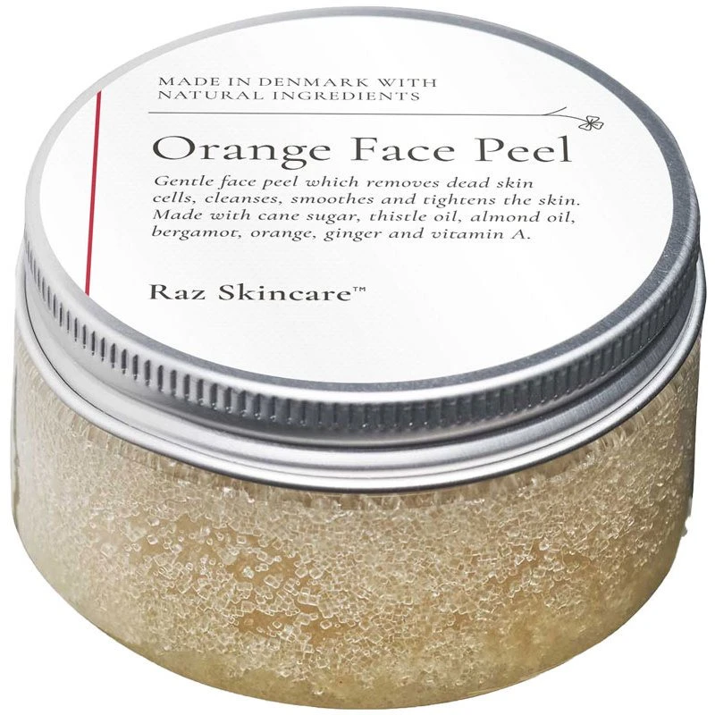 Raz Skincare Orange Face Peel er en blid ansigstpeeling, som renser og fjerner døde hudceller samtidig med, at den udglatter og opstrammer huden. Når peelingen kombineres med vand, dannes der en mild AHA frugtsyre, som forsigtigt eksfolierer og opfrisker huden.