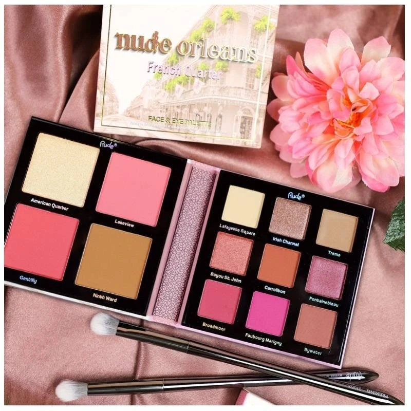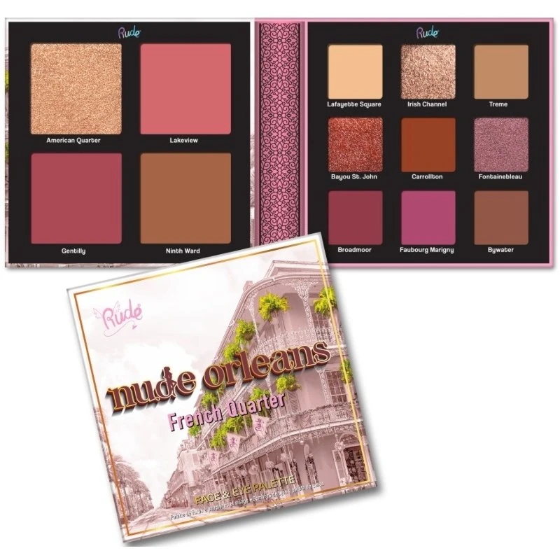 Rude Cosmetics Face & Eye palette – Nude Orleans er en super fed palette, der med sine praktiske størrelse, gør den let at have med over alt. Denne smukke og mutifunktionelle palette indeholder hele 9 forskellige øjenskygger, og 4 farver til en perfekt contour. I og med at nogle af farverne har en moderne mat finish, og nogle af de andre er med en strålende shimmer effekt, har du mulighed for hurtigt at opnå både en dagligdags makeup, men også en fest makeup på rekord tid.