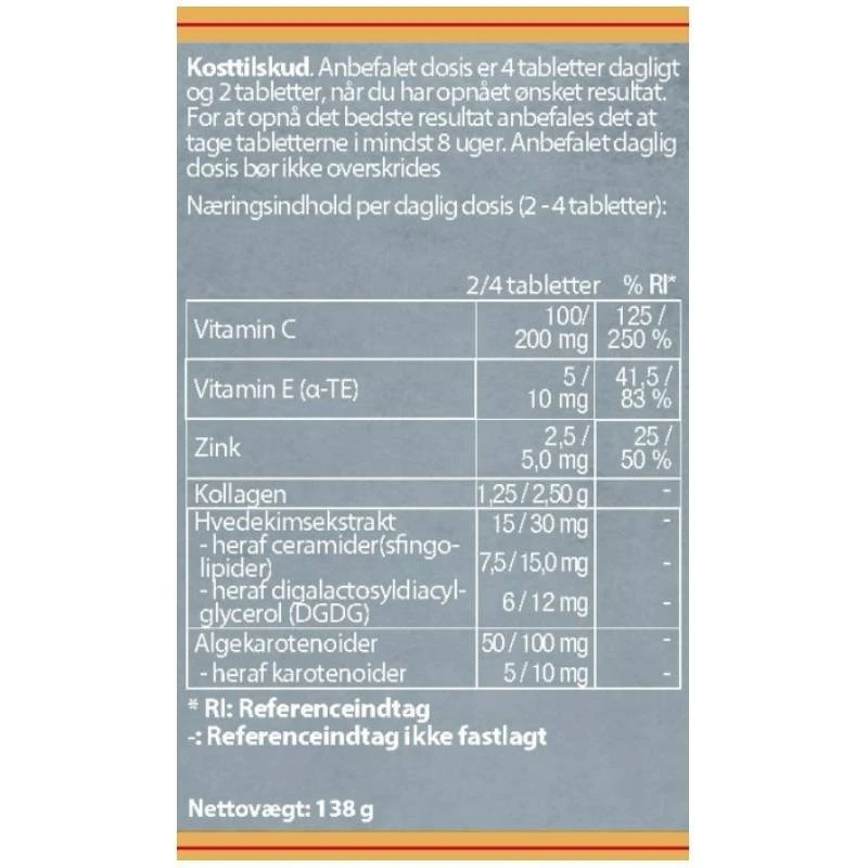 - Når huden så har opnået et resultat kan du efterfølgende nøjes med 2 tabletter dagligt