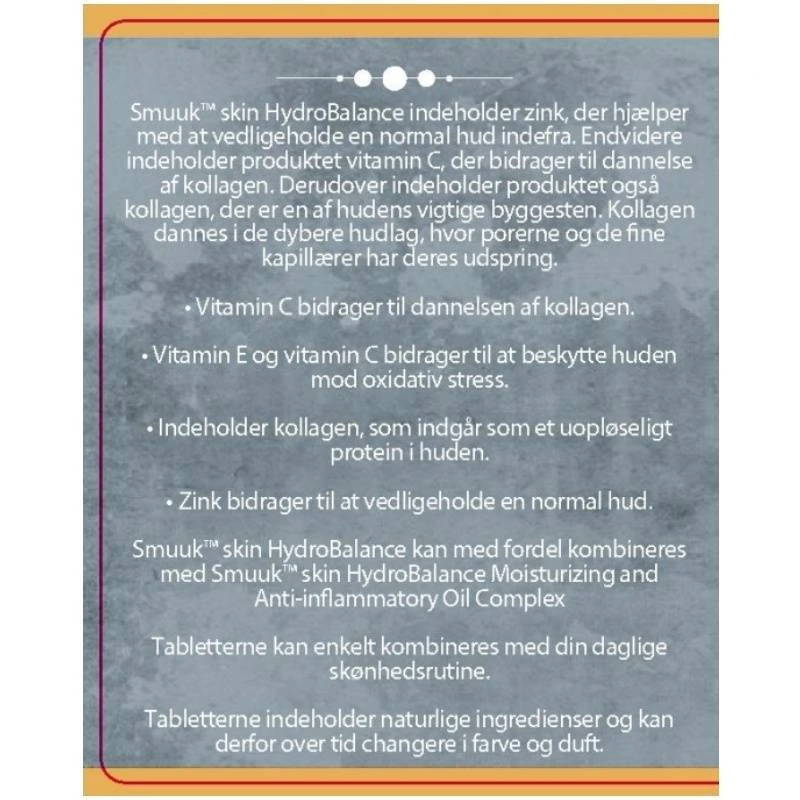 Smuuk Skin HydroBalance er et kosttilskud der indeholder C- og E vitamin, samt kollagen, zink og karotenoider. C-vitamin bidrager til normal dannelse af kollagen der har betydning for normalt fungerende hud, samt bidrager til at beskytte cellerne mod antioxidant stress og bidrager til at mindske træthed og udmattelse. Zink bidrager til at vedligeholde en normal hud.